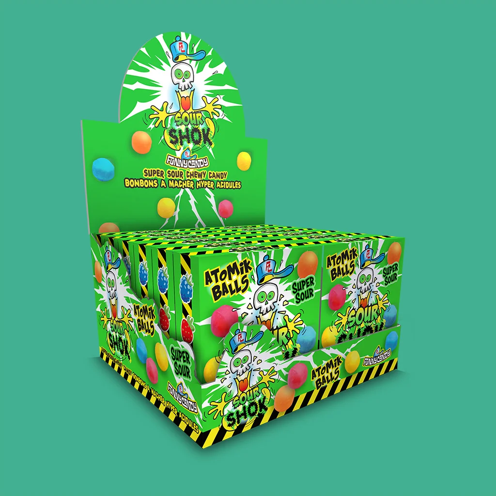 Découvrez Sour Shok Atomik Balls de Funny Candy, des bonbons à mâcher ultra acidulés qui offrent une explosion de saveurs intenses.Leur enrobage très acidulés et leur cœur moelleux procurent une sensation forte et gourmande a chaque bouchée.Présentoirs de 12 pièces.